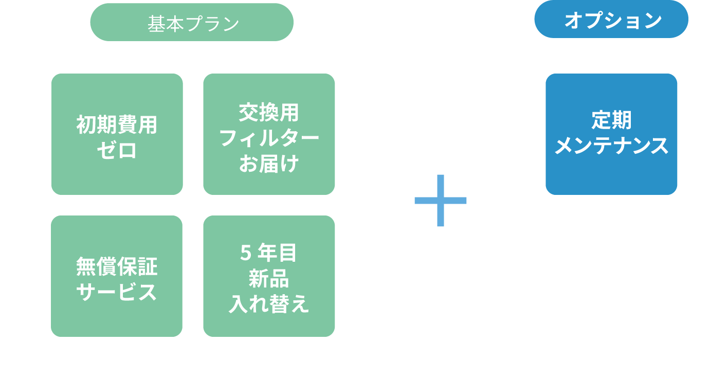本サービスは、初期費用不要な上、設置から梱包材の廃棄まですべて無償となります。オプションの定期メンテナンス契約であれば、面倒なフィルター交換や本体の清掃をすべてお任せいただけます。