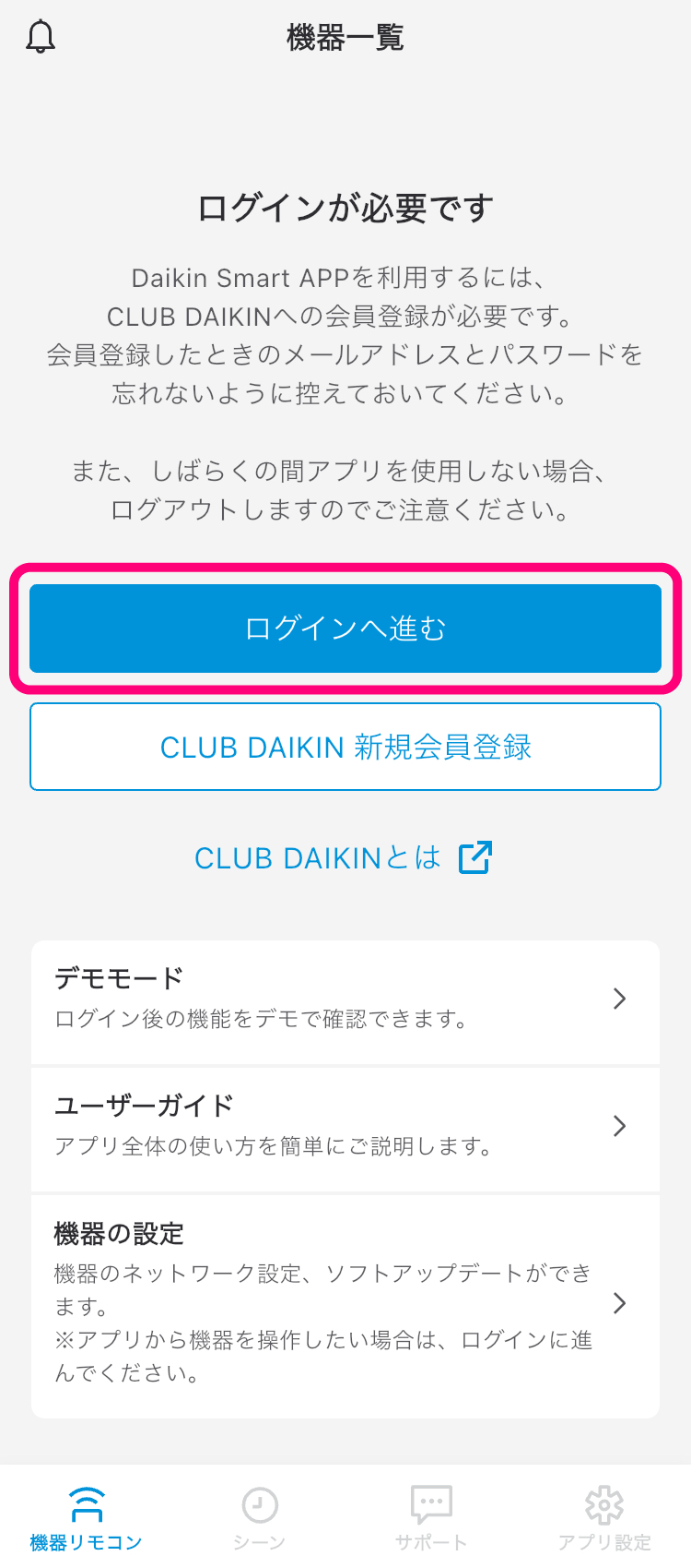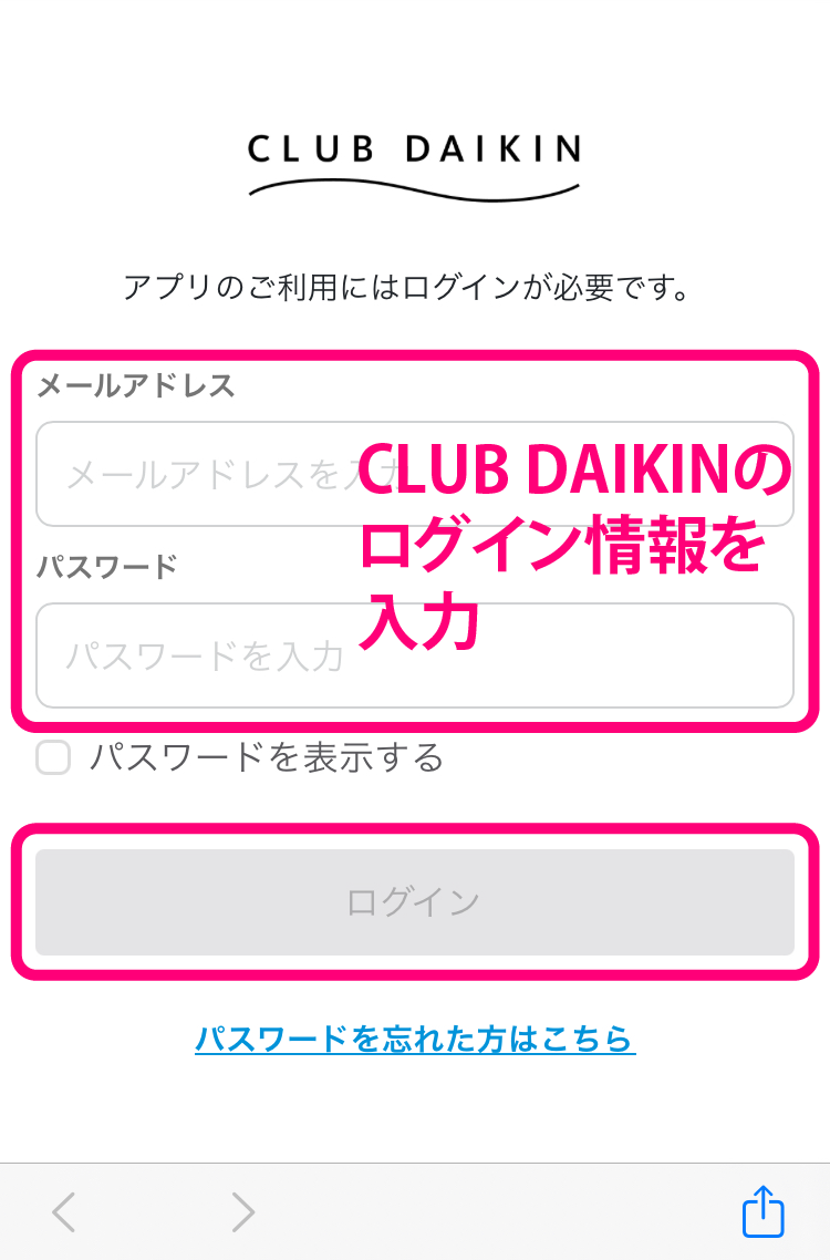 機器の接続設定や操作をするために、CLUB DAIKINで登録したログイン情報(アカウント)を使用して、本アプリにログインしてください。