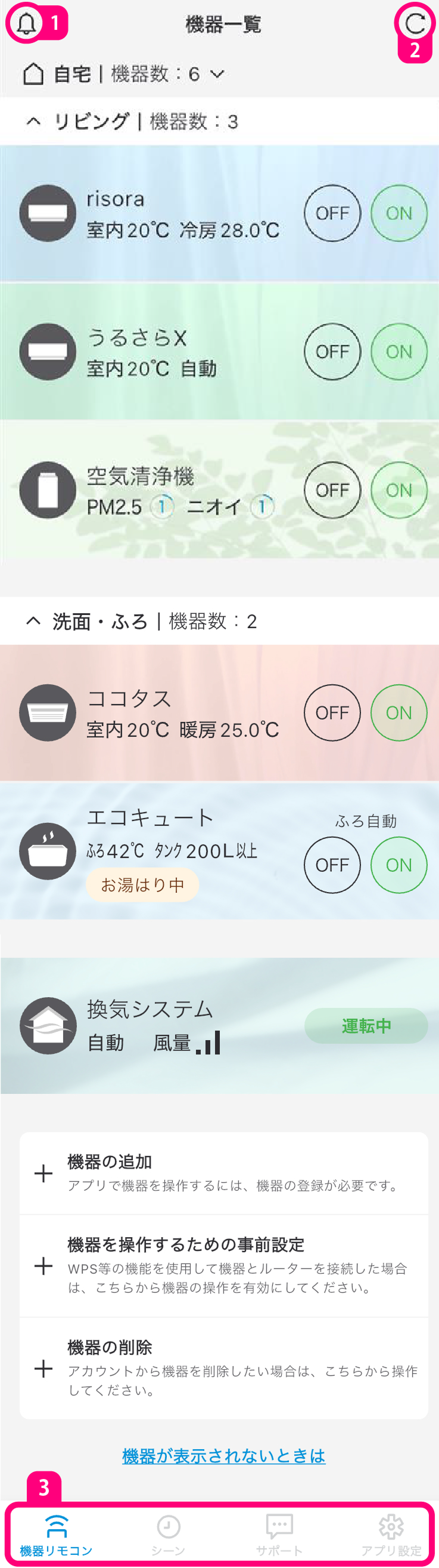 アプリメニューと表示アイコンについてアプリメニューこのページの見出しアプリメニュー 画面について タップしてダイキンからのお知らせを確認できます。未読のお知らせがある場合はマークがつきます。 タップして最新の情報を読み込みます。 アプリメニュー 機器リモコン シーン サポート アプリ設定 お知らせ ログインしていないときは、機器リモコンおよびシーンを選択しても、ログイン画面が表示されます。