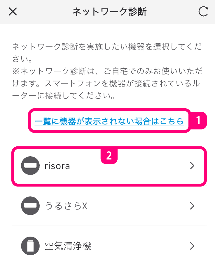 機器リモコンネットワーク診断このページの見出しネットワーク診断 機器ごとにネットワーク診断を実施できます。 画面について ご自宅のネットワークに接続しても、2 に機器が表示されない場合、タップしてください。 スマートフォンを機器に直接接続してネットワーク診断を実施します。 機器名をタップすると、選択した機器のネットワーク診断が実施できます。 お知らせ サーキュレーター、カライエはネットワーク診断に対応していません。 機種によってネットワーク診断に対応していない場合があります。 ネットワーク診断を実施するためには、ファームウェアを最新にしてください。 2 は、ご使用の端末が機器と同じネットワーク内にいるときに表示されます。