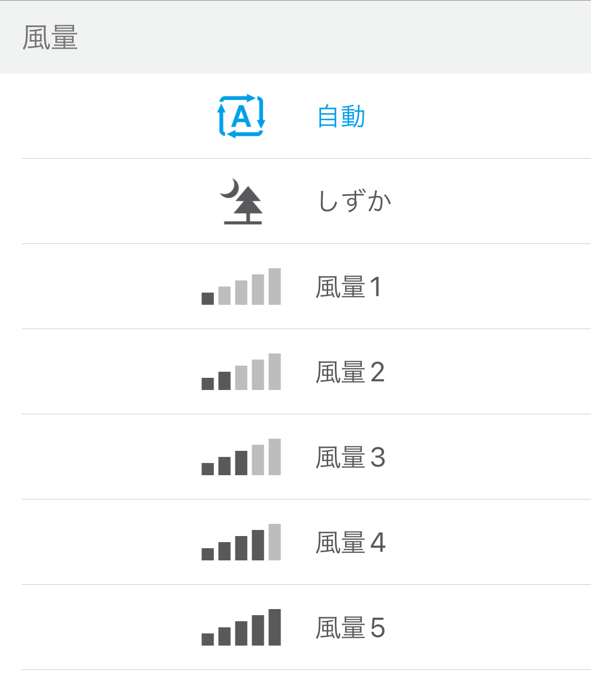 自動、しずか、風量1~5から選択できます。