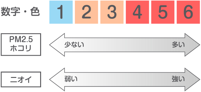 PM2.5やホコリの多さ、ニオイの強さを、6段階の数字と3段階の色でお知らせします。-