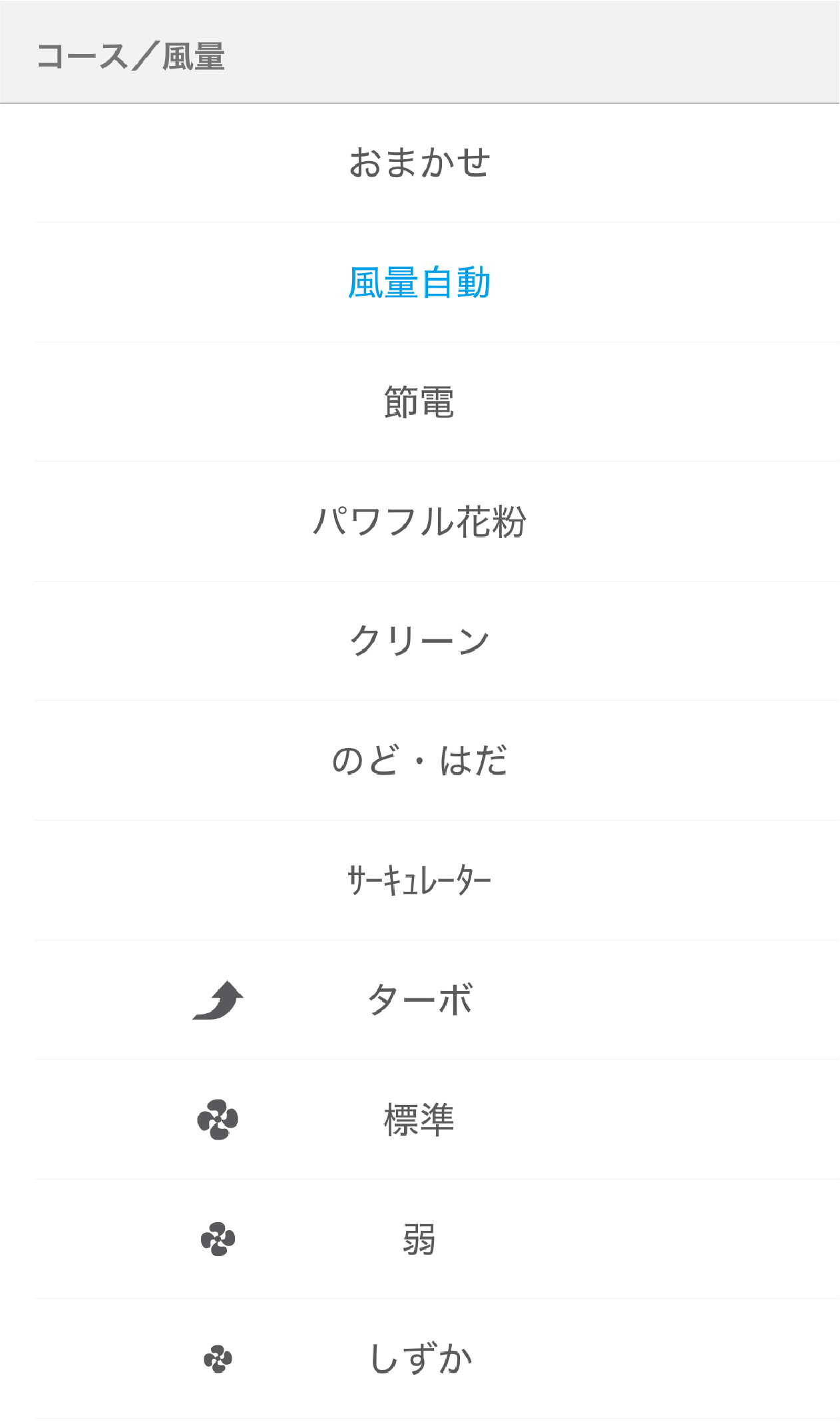 - コース「花粉」、「浮遊飛沫」、風量「強」が表示される機種もあります。
