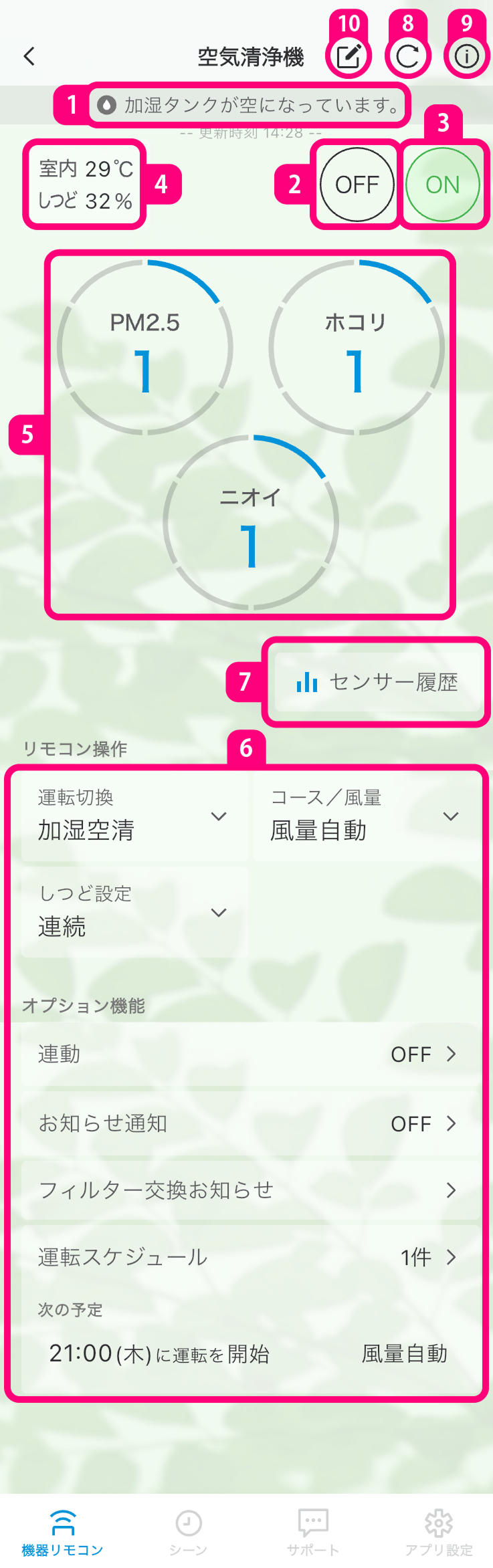 お部屋の空気に汚れが発生したときや給水のタイミング、またフィルター交換時期が近づいていることをお知らせする機能です。
