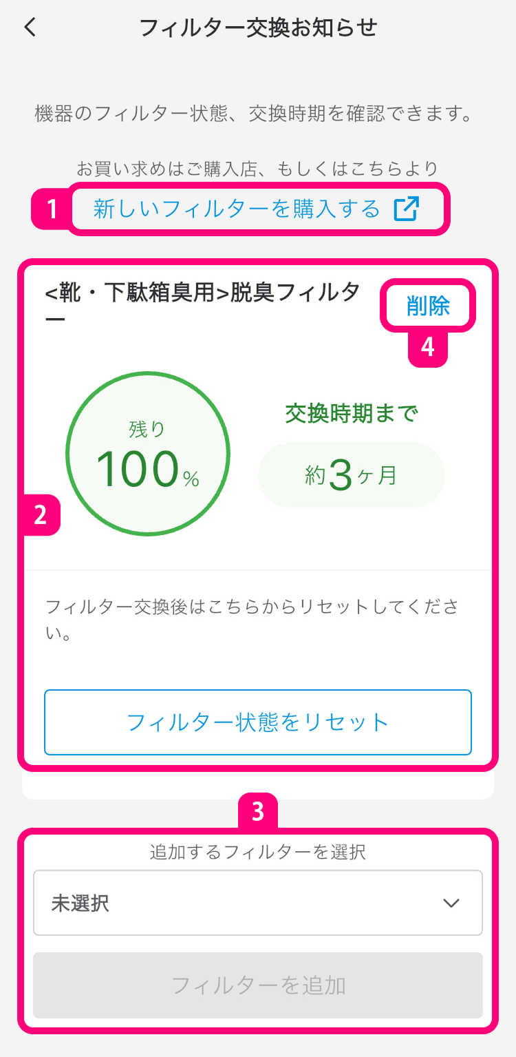 また、「フィルター状態をリセット」をタップするとフィルター寿命数値をリセットできます。- 集塵フィルターは、【1】交換時期まで1カ月と【2】交換時期になったときにフィルター寿命数値をリセットできます。