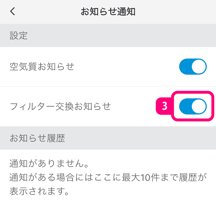 スライドしてフィルター交換お知らせ通知設定の「ON/OFF」を切り換えます。