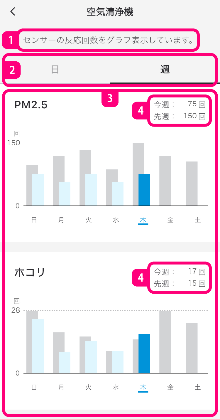 - 確認したい曜日の棒グラフをタップすると、今週のその曜日の反応回数と、先週の同じ曜日の反応回数が表示されます。
