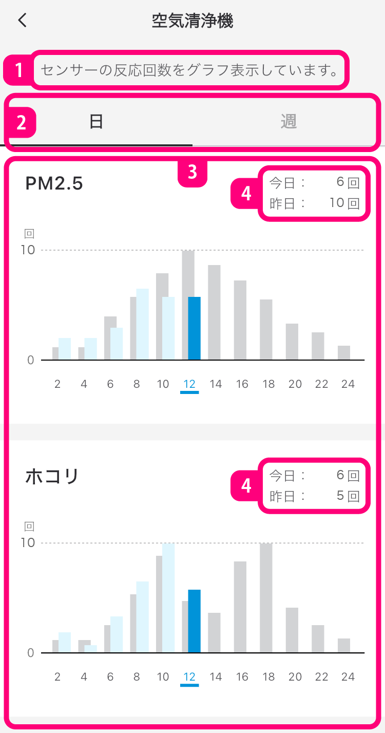 - 確認したい時刻の棒グラフをタップすると、その時刻の反応回数と、昨日同時刻の反応回数が表示されます。