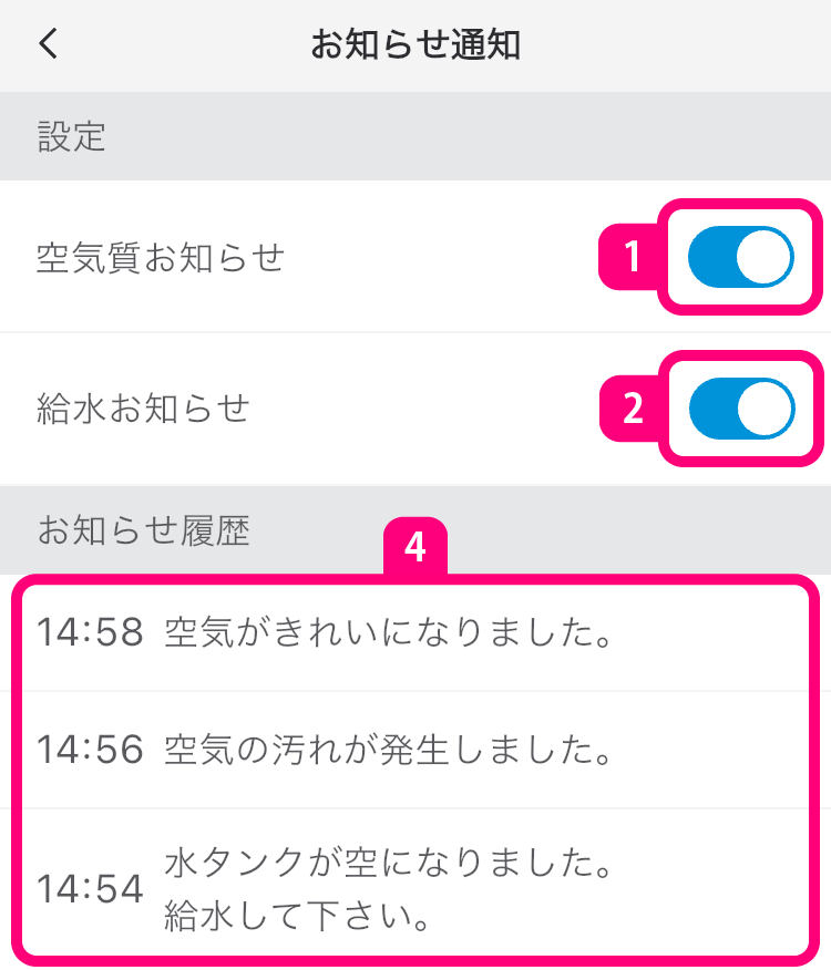 加湿ストリーマ空気清浄機70タイプのお知らせ通知設定画面