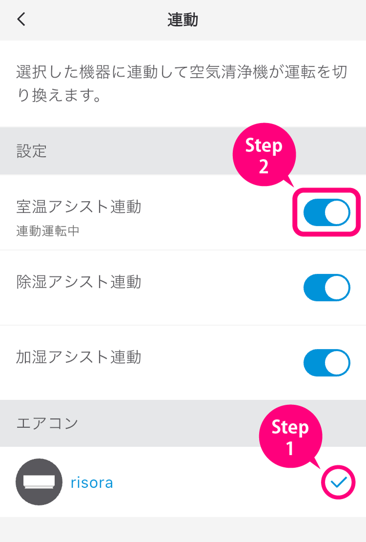 連動させたいエアコンを選び、上部のボタンをスライドさせます。