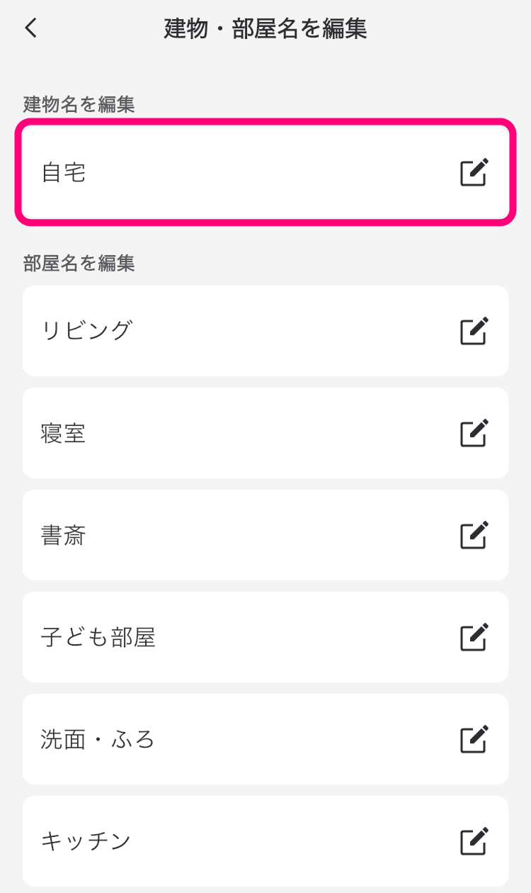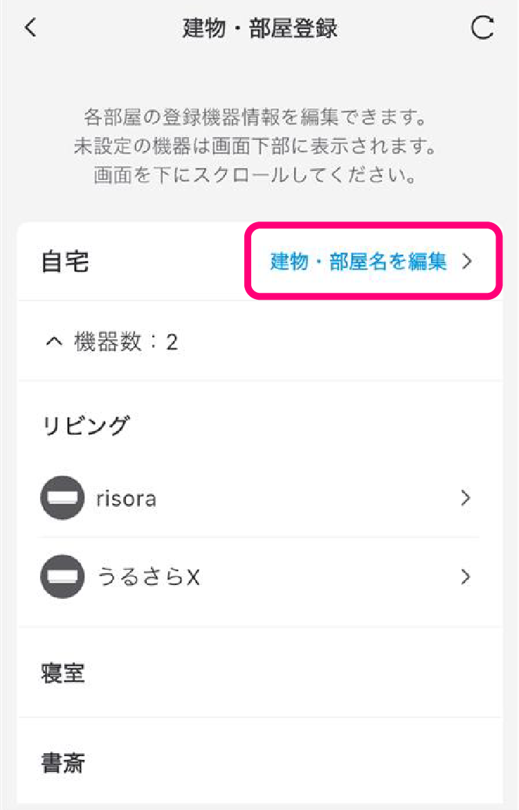 シーン建物・部屋名を編集このページの見出し建物・部屋名を編集 機器を登録する建物と部屋の名称を設定します。 画面について 設定したい建物または部屋をタップして名称を入力します。 お知らせ 建物名称・部屋名称は14文字以内で入力してください。 1部屋に10台まで機器の登録ができます。 建物や部屋名はテキストなどの別のファイルからコピーして貼り付けずに直接入力してください。 大量の文字列を入力ボックスにコピーして貼り付けると正常に貼り付けできないことがあります。