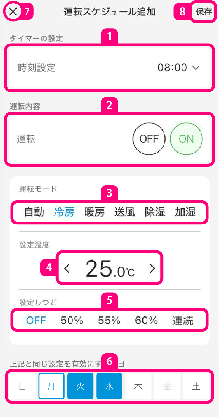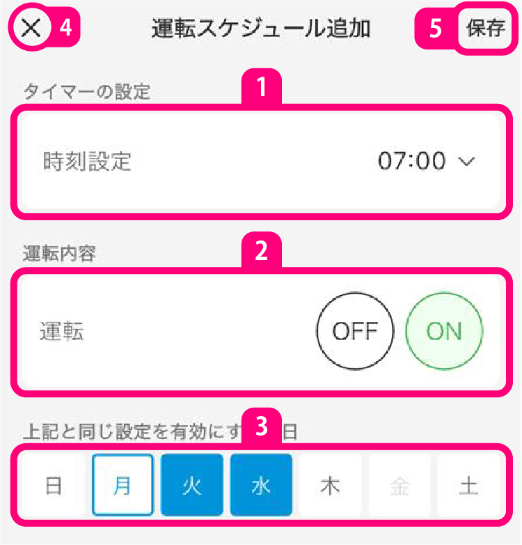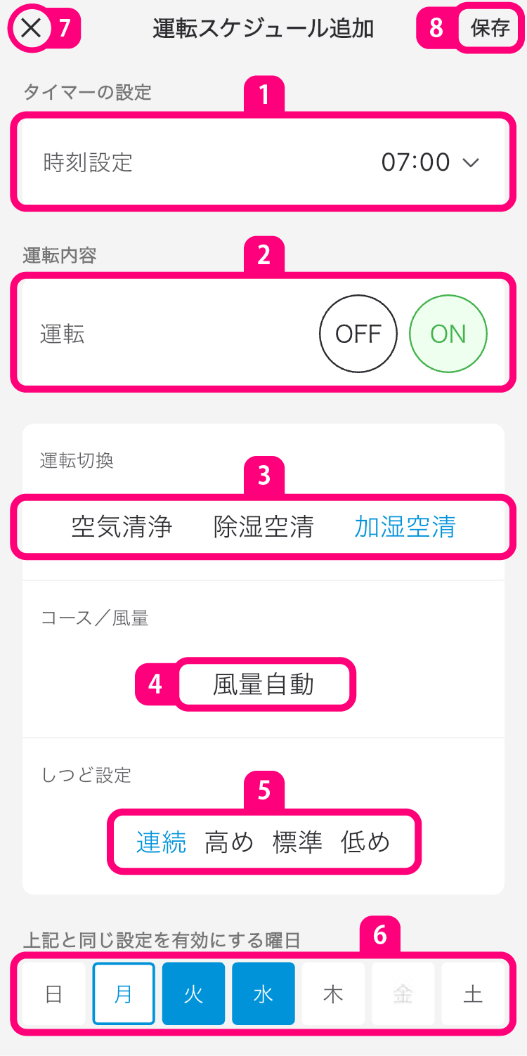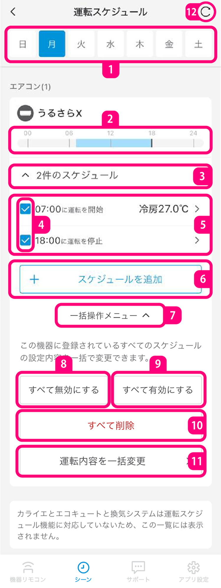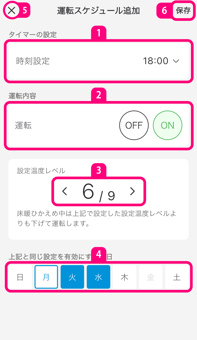 (追加できる運転スケジュールは各曜日あたり最大6つです)→ 運転スケジュール追加 エアコン