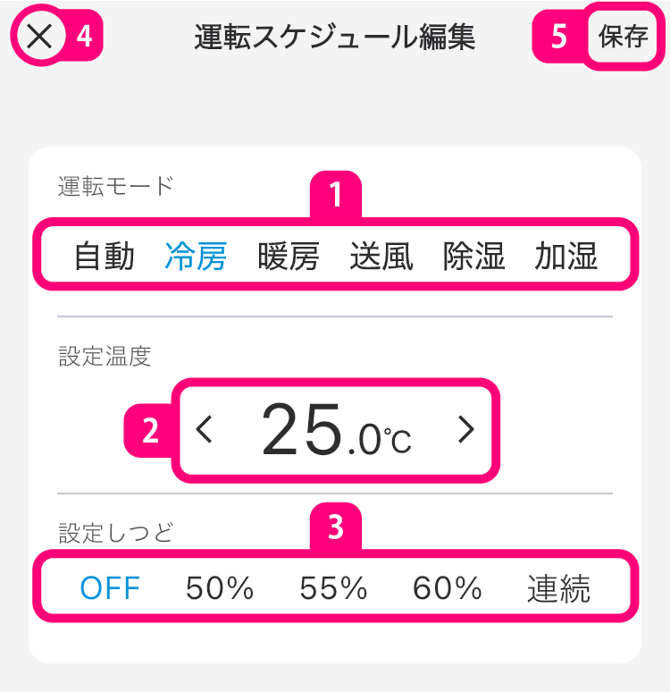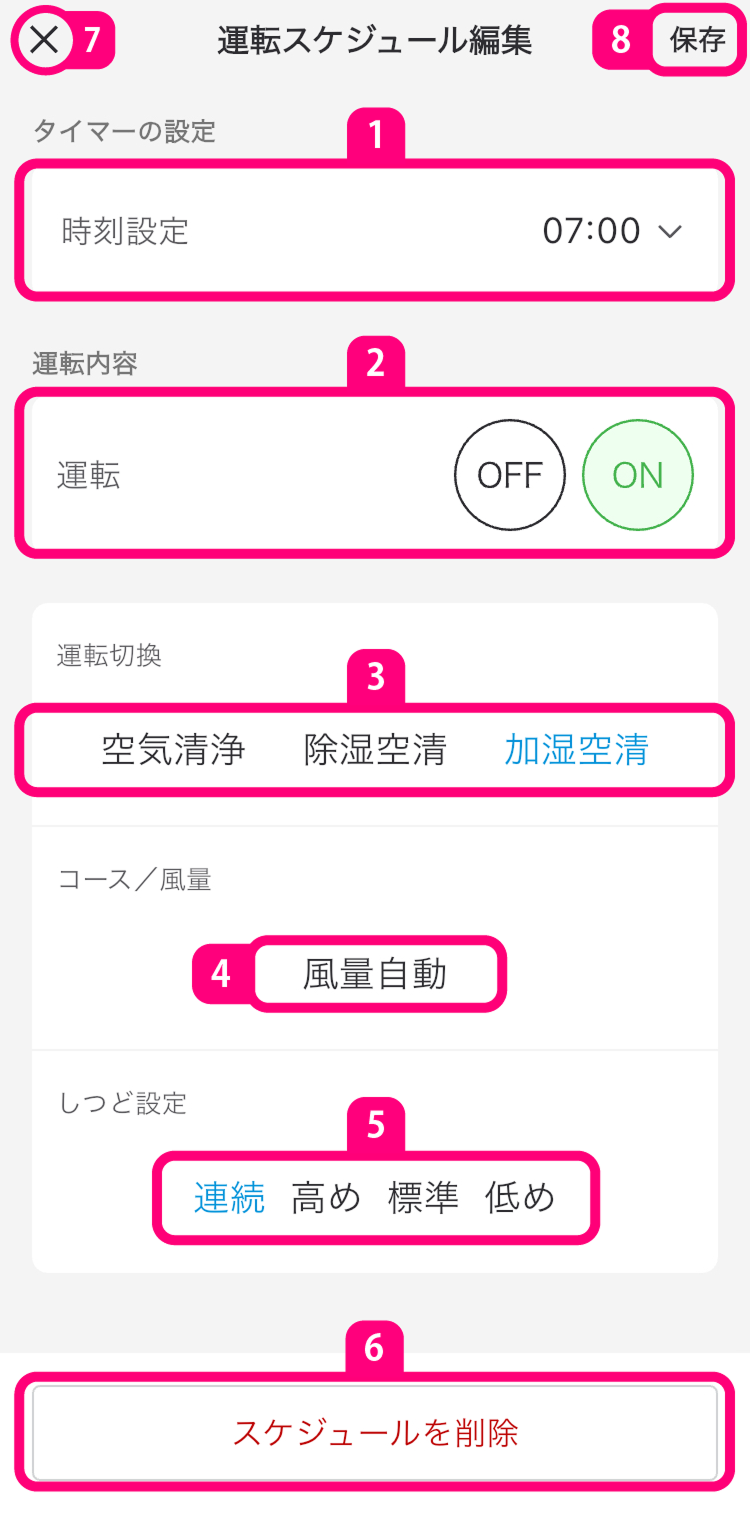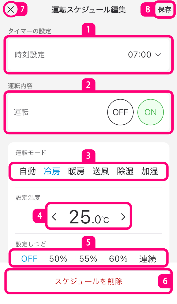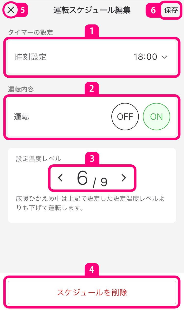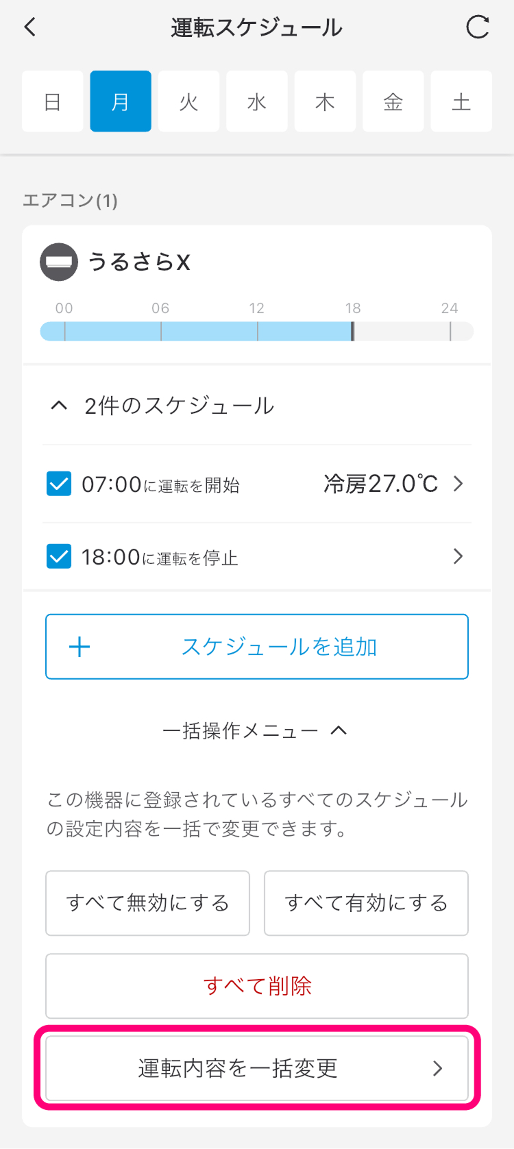 (追加できる運転スケジュールは各曜日あたり最大6つです)→ 運転スケジュール追加 エアコン