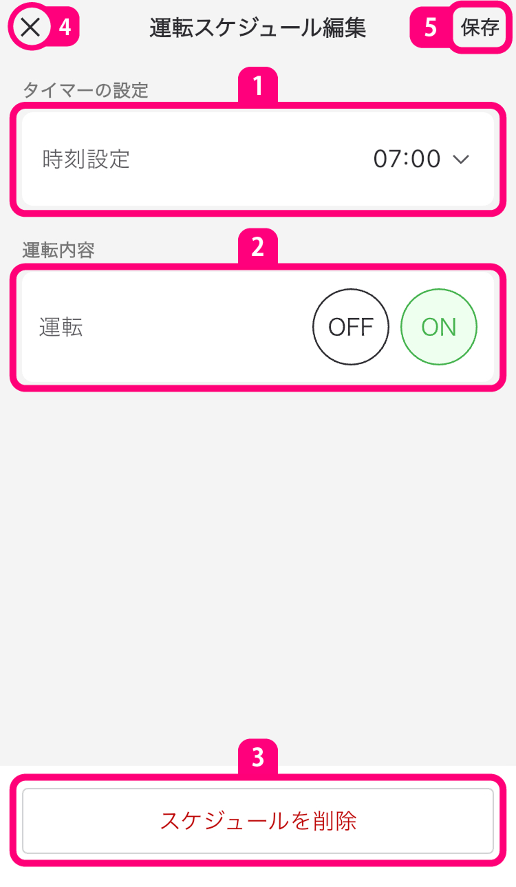 各項目をタップして該当の運転スケジュールの設定・削除をします。→ 運転スケジュール編集 エアコン