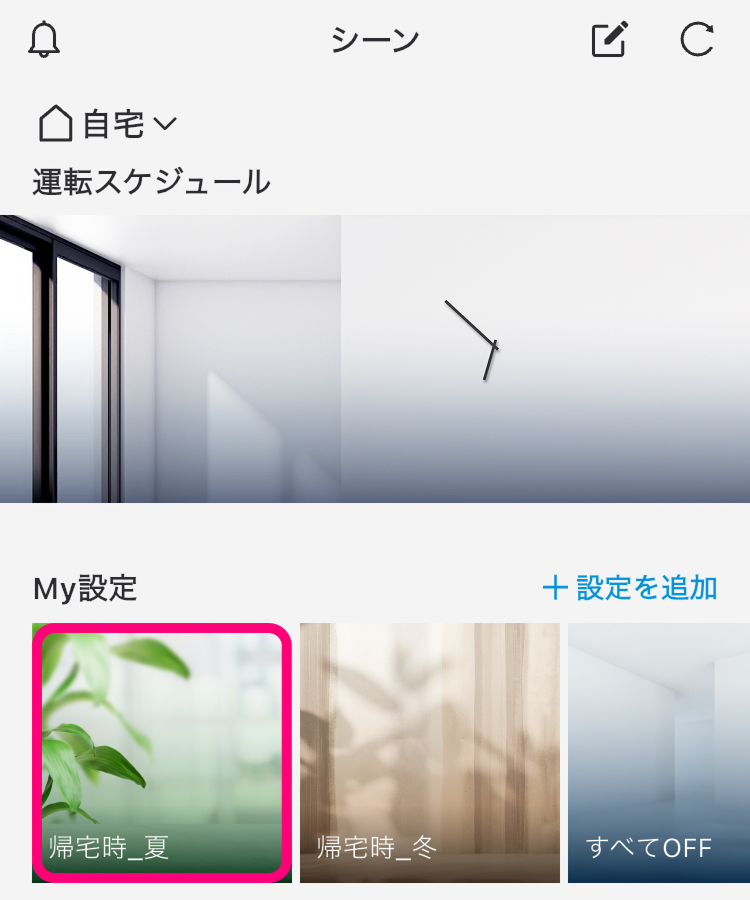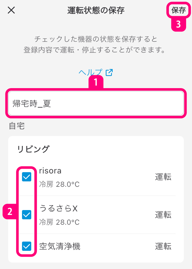 エアコン、空気清浄機、サーキュレーターや換気システムの現在の運転状態を保存します。カライエ、エコキュート、床暖房は対象外です。