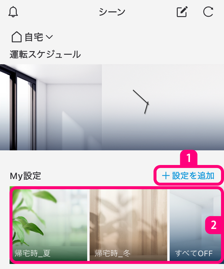 建物および部屋に登録されている機器の現在の運転状態を保存します。保存済みの設定を選択すると、保存した機器の運転状態にします。