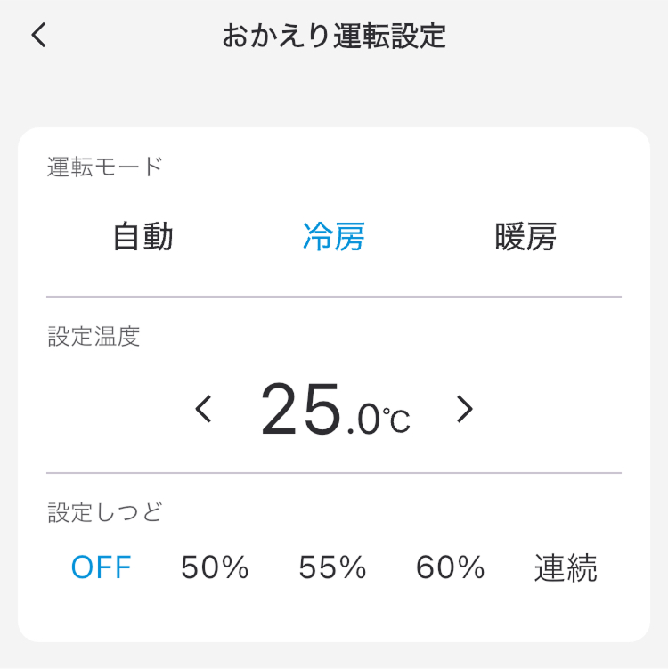 - 運転モードが自動の場合、設定温度は設定できません。標準±0℃でおかえり運転を開始します。