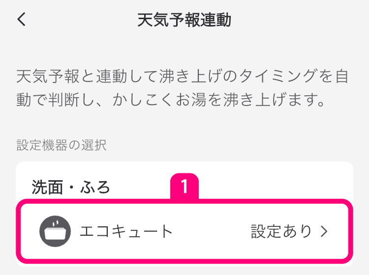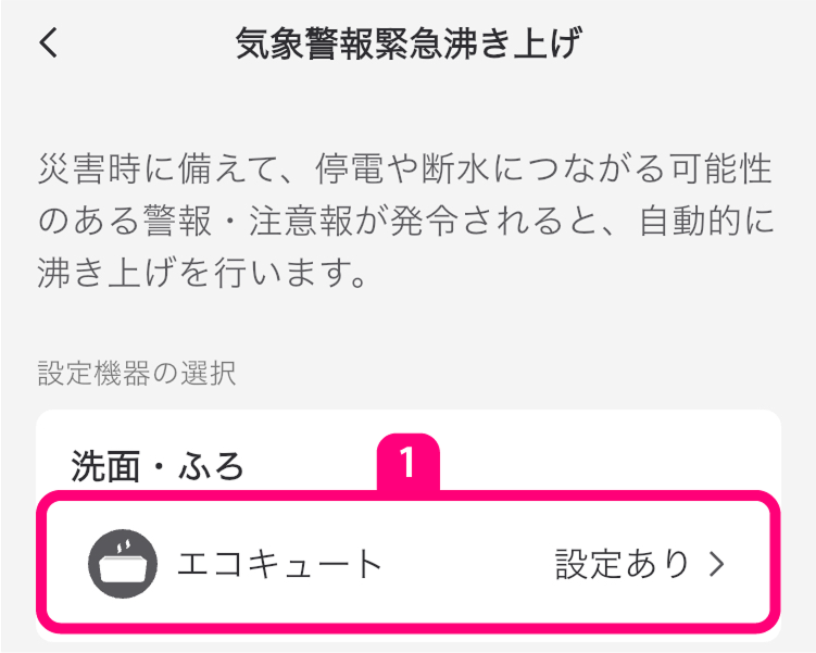 - 機器名をタップすると、気象警報緊急沸き上げの設定ができます。