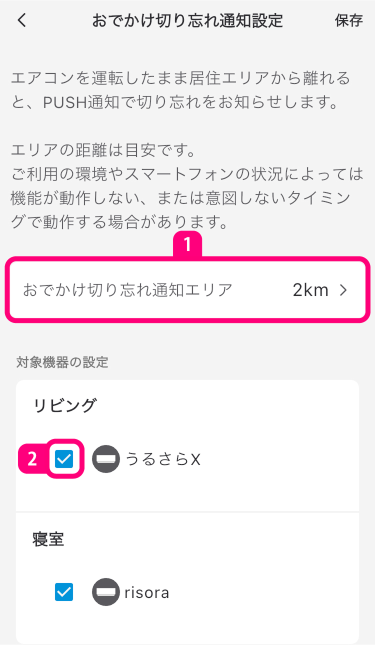 おでかけ切り忘れ通知エリアから出たときに、エアコンの切り忘れを通知します。