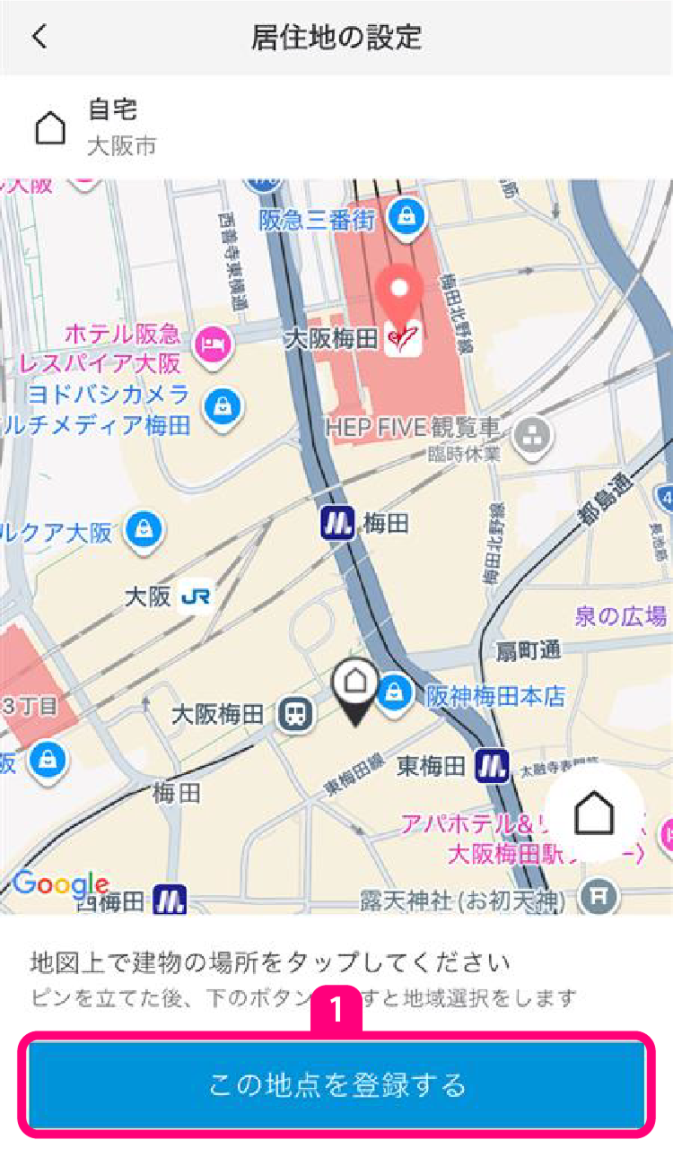 居住地の設定をしたことのある方は、以前設定した場所に表示されます。 をタップすると居住地ピンが画面の中心に戻ります。