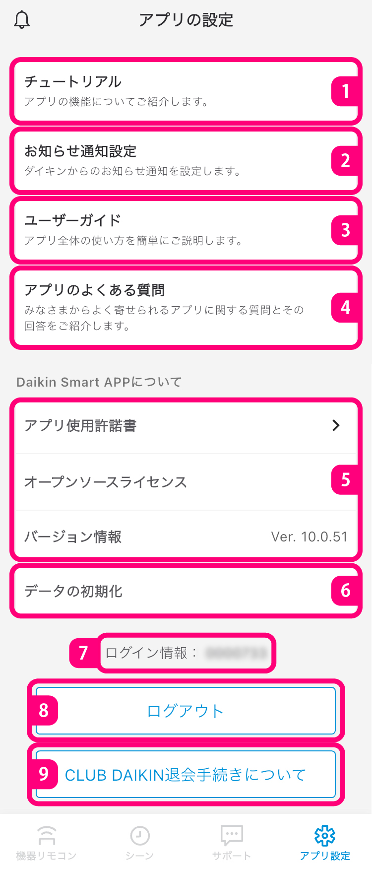 - ログインしていないときは、1、2、6、7、8、9 は表示されません。