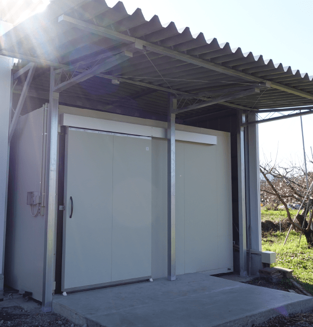 今回は冬の間に干し柿や干し芋などの加工品を冷凍保管するための新築冷凍庫に、ダイキンの「冷凍ZEAS(ワイドレンジタイプ)」をご採用頂きました。冷凍と冷蔵が簡単に切替できることで、秋は主力の桃やぶどうを保管できるようになり、年間を通じてフレキシブルに運用できる点に期待を頂いています。