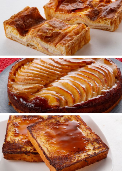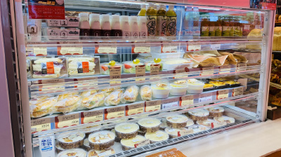 ヨーグルト、ラザニア等、パン・ケーキ以外の商品も所狭しと並ぶ。
