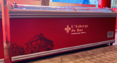 冷凍商品の販売コーナー。大きなガラス扉で、陳列物が見やすい。カッティングシートを貼って頂き、内装に合わせてご使用頂いている。