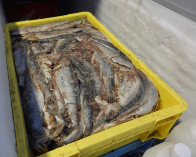 餌の冷凍ニシンは毎日出し入れを繰り返している(一日あたり約45kg使用)