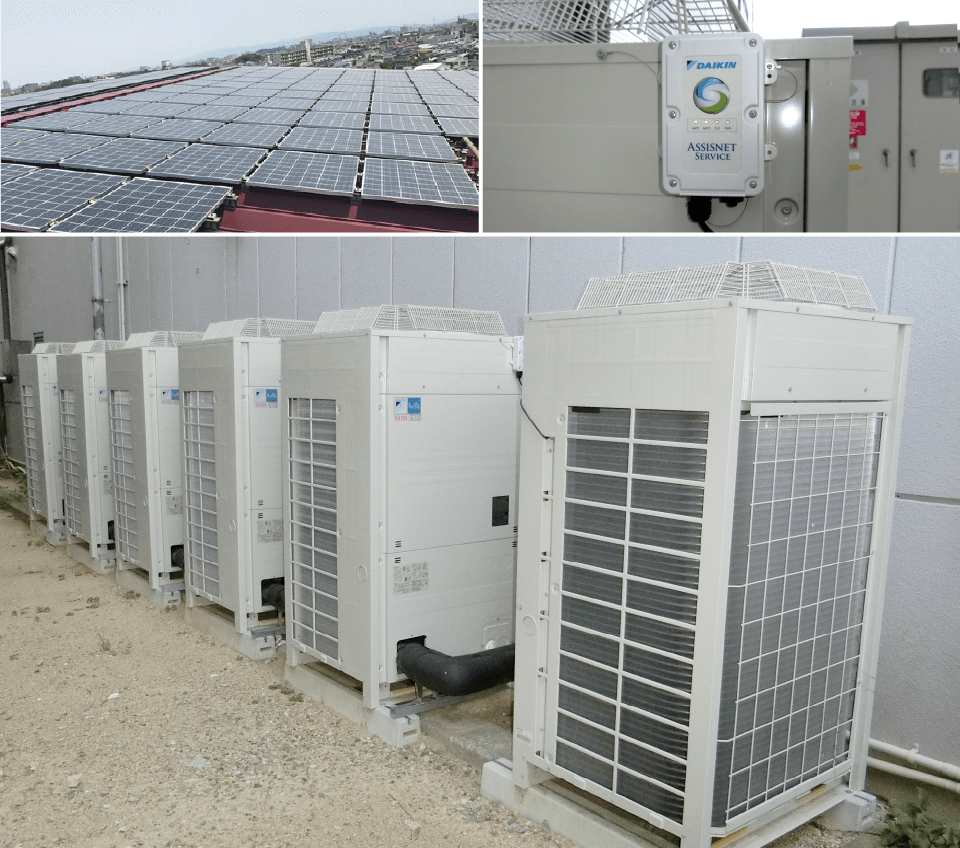 複数系統でリスク分散。冷凍冷蔵機器の電力30%を太陽光パネルで賄われています。室外機にはIoT機器アシスネットサービスを接続することで、万が一のことがあってもすぐにメール発報されるため安心です。