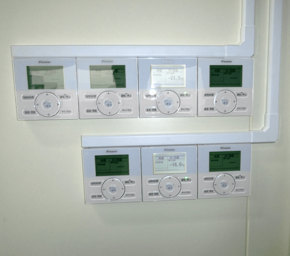 1室の倉庫を複数台の冷凍機で冷却しており、デフロストは2グループに分け交互に3時間毎に入るように設定しています。そのため庫内温度の上昇も少なく安心して荷物を保管できます。倉庫パネルで使用しているホシザキ様のプレハブパネルも高品質で冷えを確保できています。
