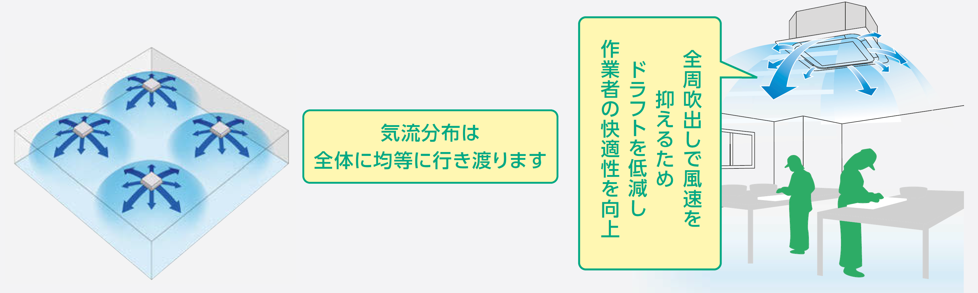 フィルターダクトからの全周吹出方式による微風で作業者の快適性を確保しながら食品加工に適した低温環境を実現します。