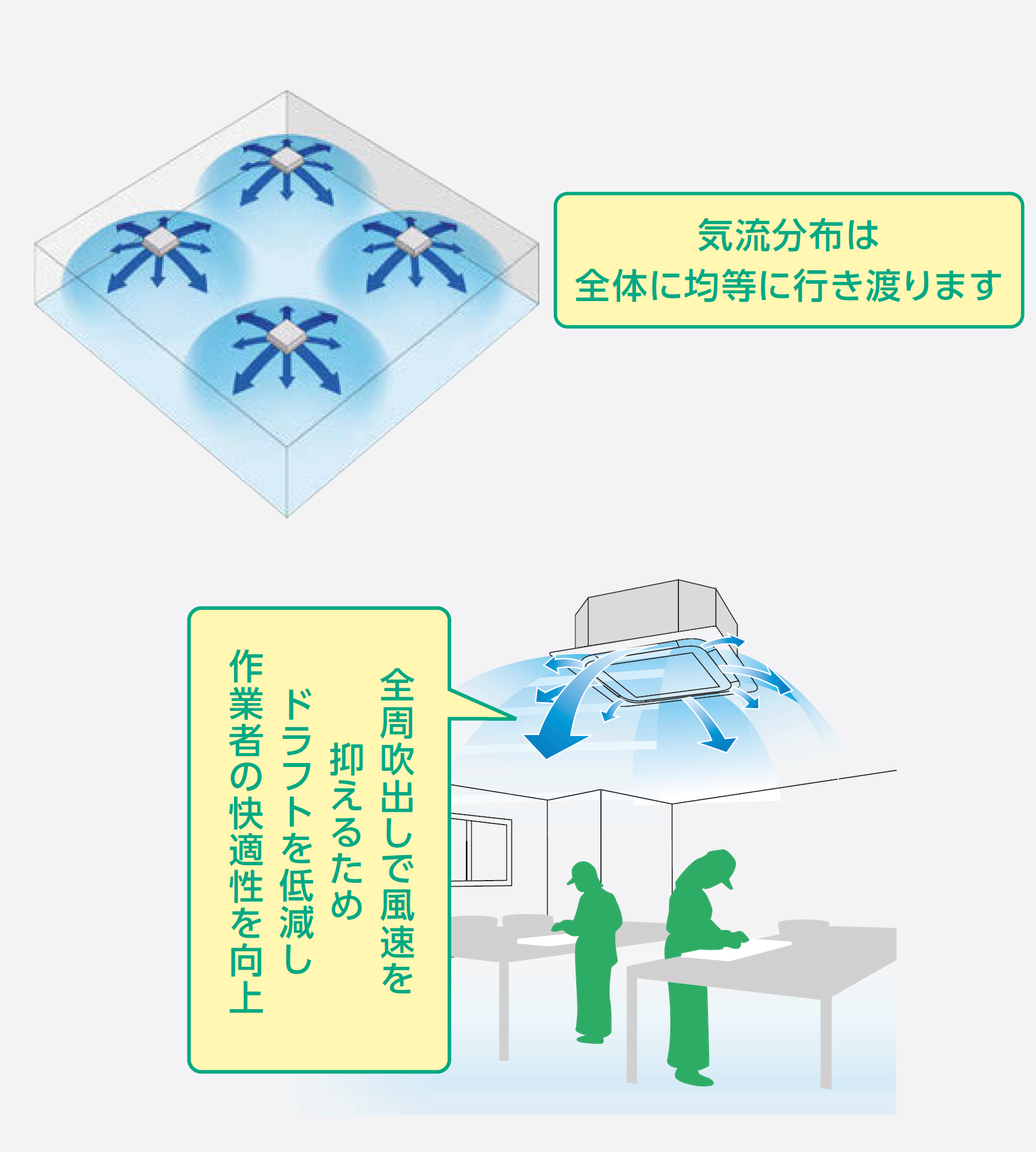 360°全周吹出しのラウンドフローカセットにより、室内全体に均一な温度気流分布を実現。