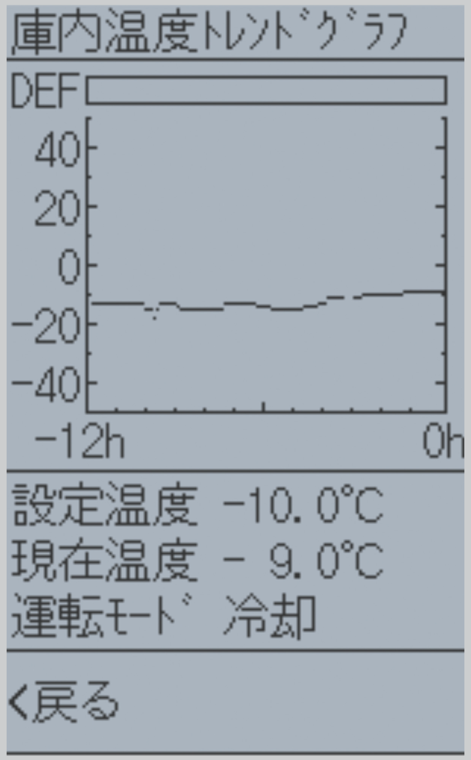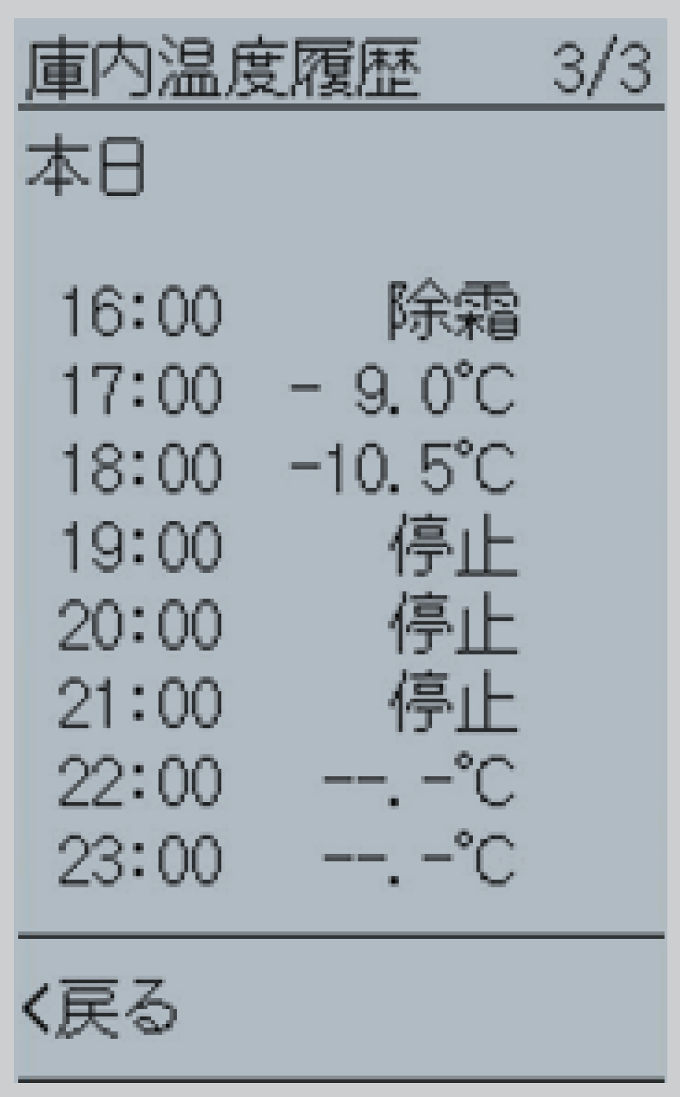 品質管理やメンテナンスの際の有用データとして過去24時間の庫内温度変化をグラフ表示。また、過去3日間の1時間毎の庫内温度を記録します。