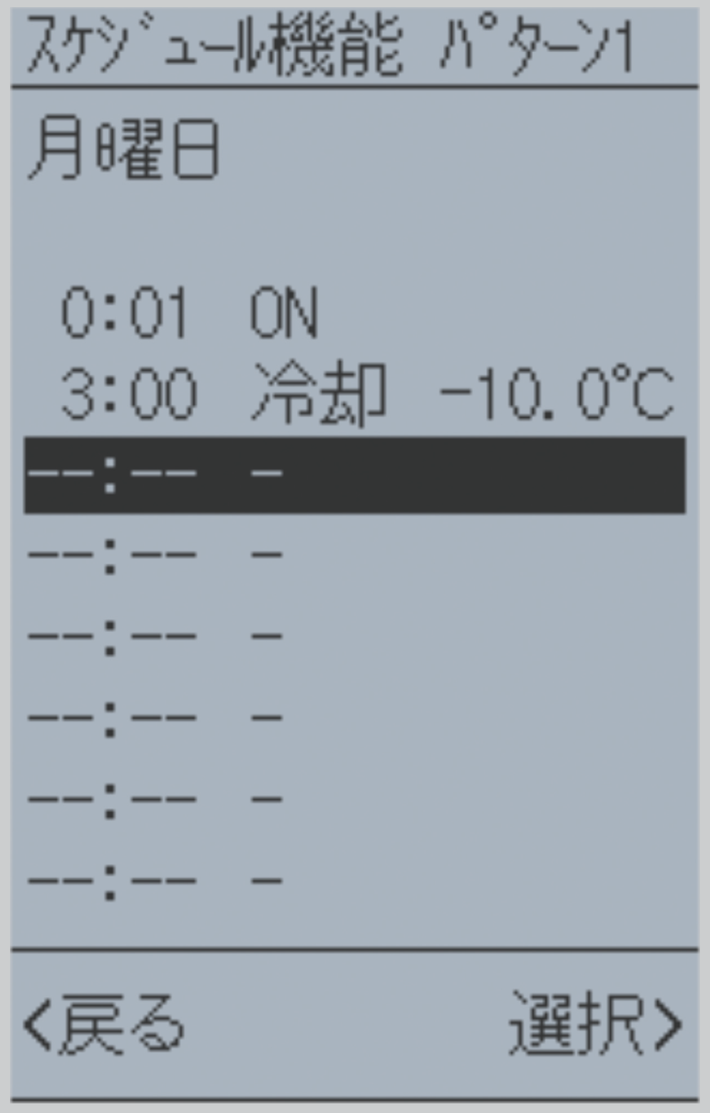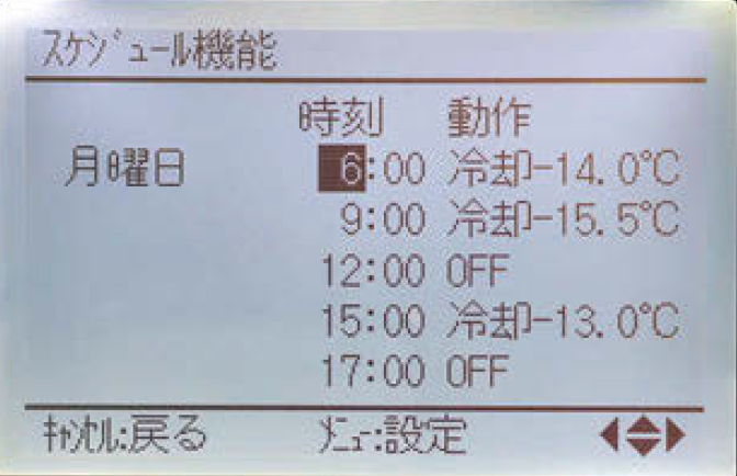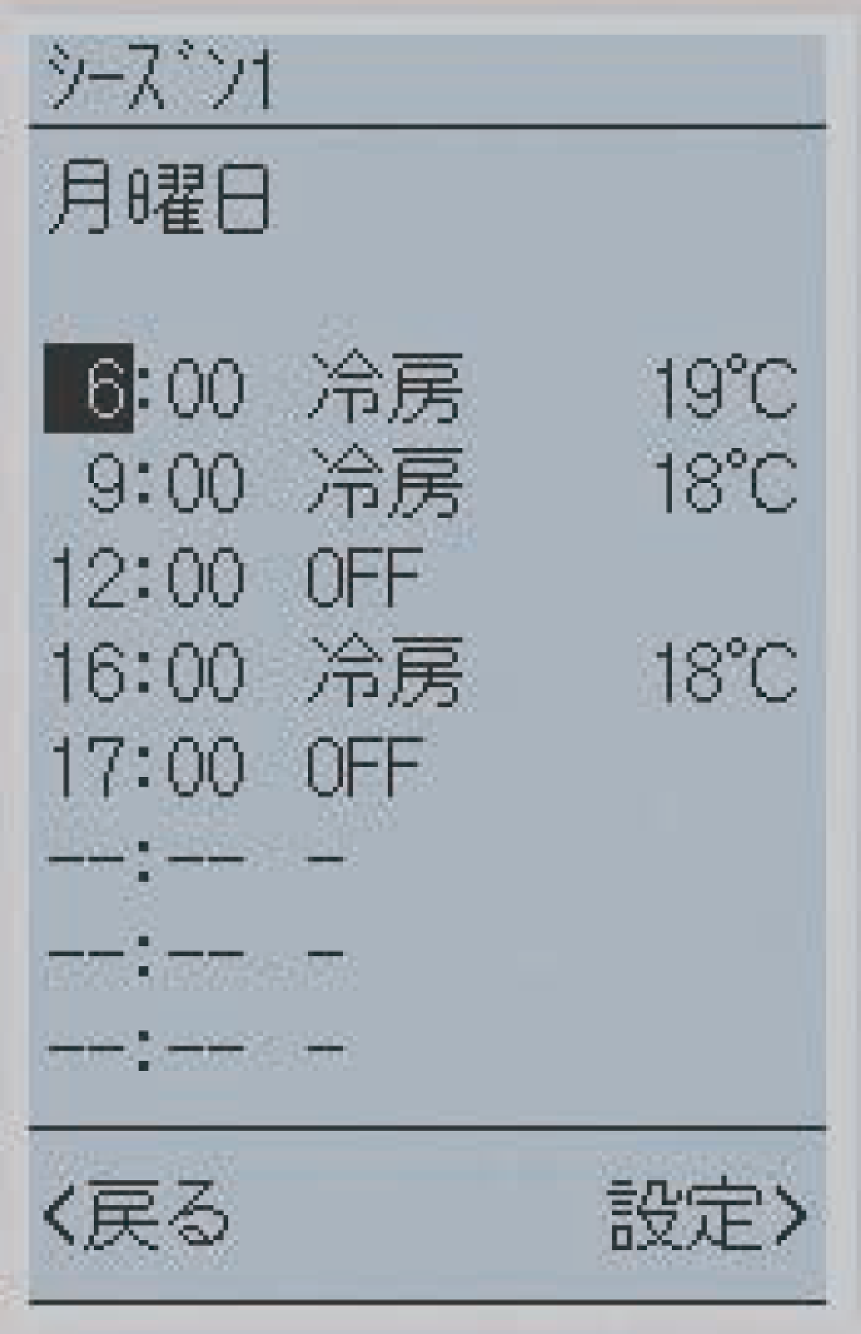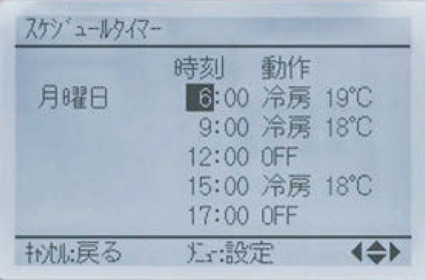 曜日ごとに運転/停止や設定温度の変更を分単位で最大5つまで設定可能。