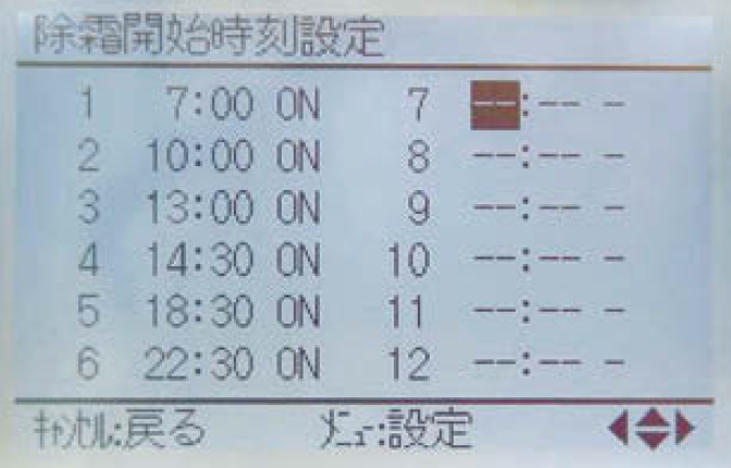 強制除霜運転の開始時間を1日最大12回まで10分単位で設定できます。