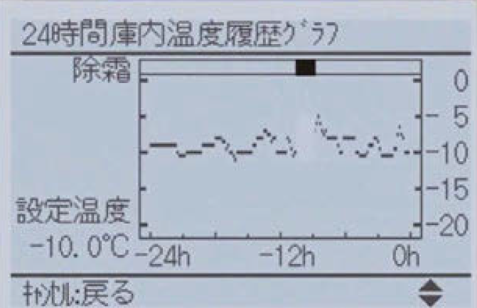 品質管理やメンテナンスの際の有用データとして、過去24時間の庫内温度変化をグラフで表示できます。