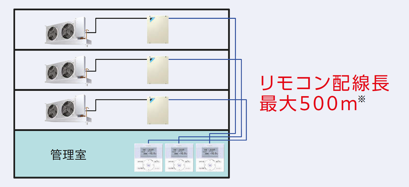複数フロアに分散設置された冷凍機でもリモコンを管理室にまとめれば、離れた場所からでも運転状況を確認できます。