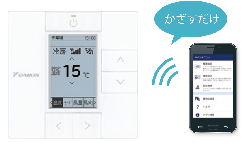 専用アプリをダウンロードしたスマートフォンをリモコンにかざすだけで画面表示も設定も変更可能。現地での設定作業を効率化します。