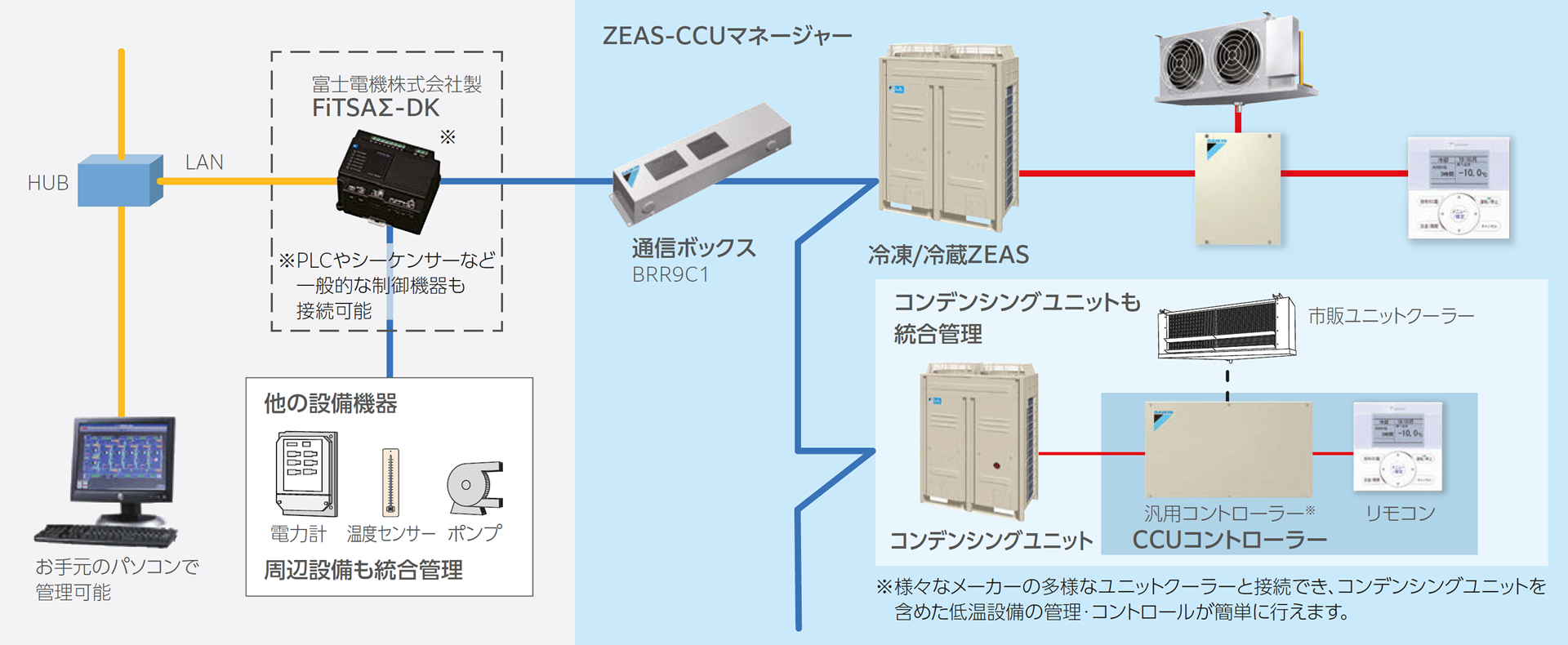当社の低温用エアコン「冷凍/冷蔵 ZEAS」やコンデンシングユニットで展開する複数の低温設備をお手元のパソコンで集中監視・制御が行えるシステムです。