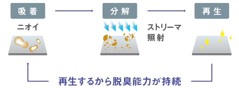 脱臭フィルターでニオイを吸着して、ツインストリーマですばやく分解。脱臭フィルターの効果と組み合わせて脱臭量が2倍に。