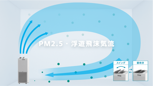PM2.5とは2.5μm以下の微小粒子状物質の総称です。この空気清浄機では0.1μm未満の微小粒子状物質について、除去の確認ができていません。また、空気中の有害物質すべてを除去できるものではありません。32m3(約8畳)の密閉空間での効果であり、実使用空間での結果ではありません。試験機:MCK905Aと同等機種(MCK904A)で実施。