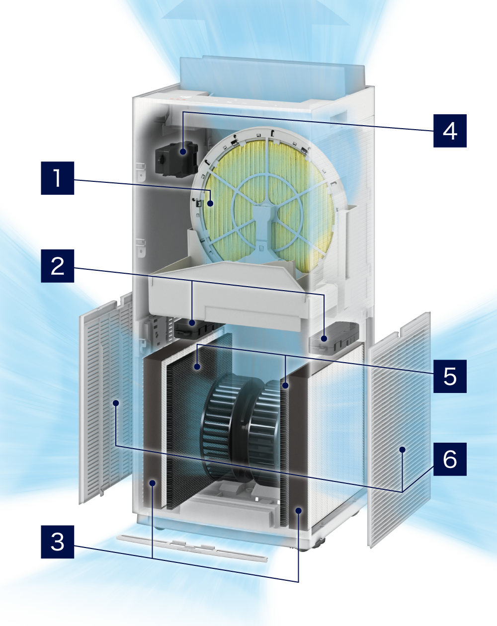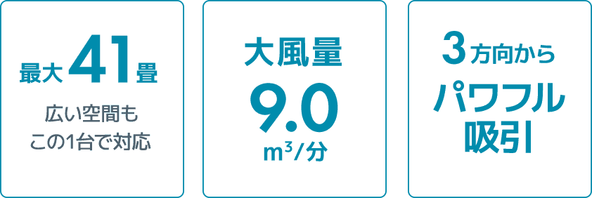 ファン口径サイズアップにより大風量9.0m3/分を実現。本体正面下部・左右から空気の汚れをパワフルに吸引。