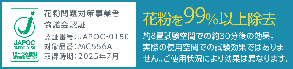 • 25㎥(約6畳)の密閉した試験空間で日本電機工業会規格JEM1467に基づく試験方法にて実施。 試験対象:浮遊した1種類のウイルスで実施。試験結果:約24分で99%以上抑制。((一財)北里環境科学センター 試験番号:北生発2025_0012号)試験機:MC556Aで実施(ターボ運転)。
