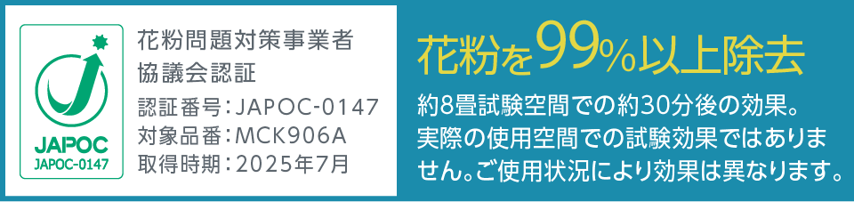 25m3(約6畳)の密閉した試験空間による約15分後の浮遊カビ菌への効果であり、実使用空間での実証結果ではありません。