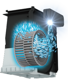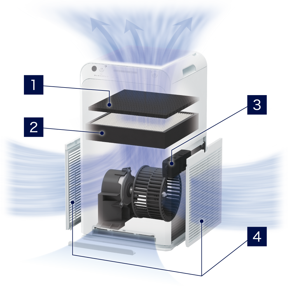 ワイドな吹き出し口の採用と、ファンをフィルターの下部に配置することによる防音効果で、人が感じる運転音に配慮しました。
