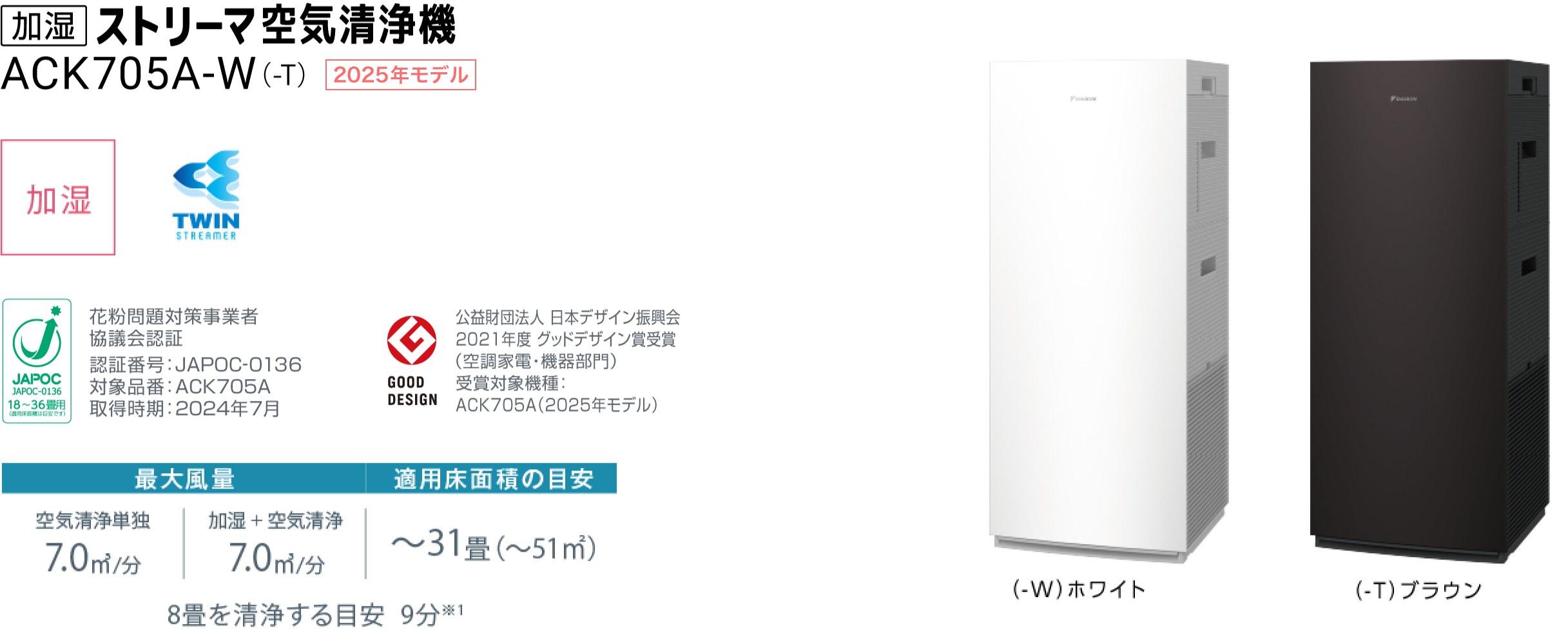 シンプルで美しいデザインにこだわり、側面・背面に至るまで上品に仕上げました。操作部、表示も天面にすっきり収めて、どの角度から見てもインテリアにフィットする高いデザイン性を実現しています。また、タワー型なので設置面積が小さく、省スペースでの設置が可能です。