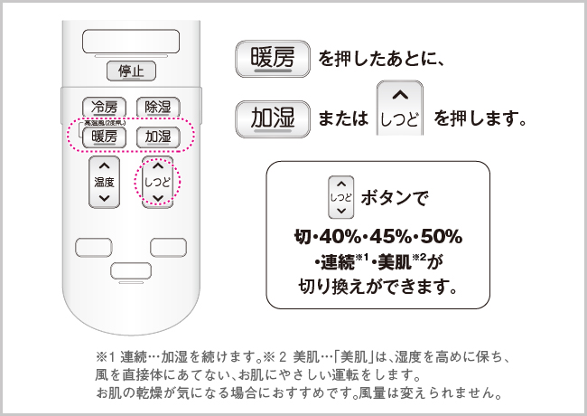 暖房運転中に「加湿」または「しつど」ボタンを押す。