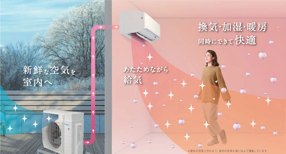 その点、給気換気方式を採用しているダイキンのエアコンなら、屋外から新鮮な空気を取り込みながら暖房ができます。そして、プレミアム暖房だと取り入れた空気は温めてからお部屋に届けるから、室内が寒くなりにくいというメリットも。