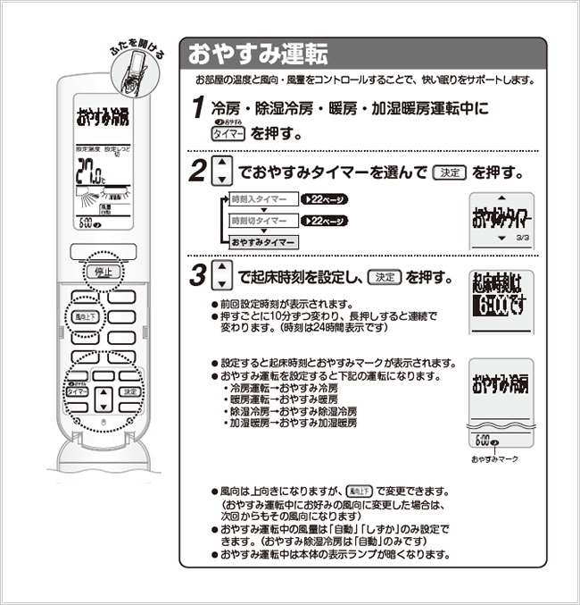 - 室温の安定後の節電運転技術「節電自動運転(温度・しつどコントロール)」:立ち上がり時と室温安定時での出力の調整を自動コントロール。